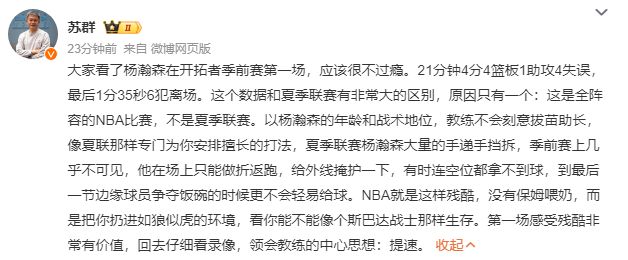 杨瀚森季前赛首秀引热议,国内评论员苏群写道:大家看了杨瀚森在开拓者季前赛第一场,应该很不过瘾。21分钟4分4篮板1助攻4失误,最后1分35秒6犯离场。这个数据和夏季联赛有非常大的区别,原因只有一个:这是全阵容的NBA比赛,不是夏季联赛。以杨瀚森的年龄和战术地位,教练不会刻意拔苗助长,像夏联那样专门为你安排擅长的打法,夏季联赛杨瀚森大量的手递手挡拆,季前赛上几乎不可见,他在场上只能做折返跑,给外线掩护一下,有时连空位都拿不到球,到最后一节边缘球员争夺饭碗的时候更不会轻易给球。NBA就是这样残酷,没有保姆喂奶,而是把你扔进如狼似虎的环境,看你能不能像个斯巴达战士那样生存。第一场感受残酷非常有价值,回去仔细看录像,领会教练的中心思想:提速。